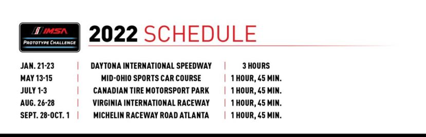 The season opens with a three-hour race as part of the Roar Before the Rolex 24 At Daytona weekend on Jan. 21-23. All other races will be one hour and 45 minutes in length, beginning with Mid-Ohio on May 13-15, followed by Canadian Tire Motorsport Park on July 1-3, VIRginia International Raceway on Aug. 26-28 and Michelin Raceway Road Atlanta on Sept. 28-Oct. 1.