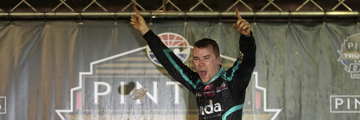 BRISTOL, Tenn. – Overcoming a mistake in communication, Ben Rhodes charged to the front in the closing laps of Saturday’s Pinty’s Truck Race on Dirt snatched the NASCAR Camping World Truck Series victory from runner-up Carson Hocevar.