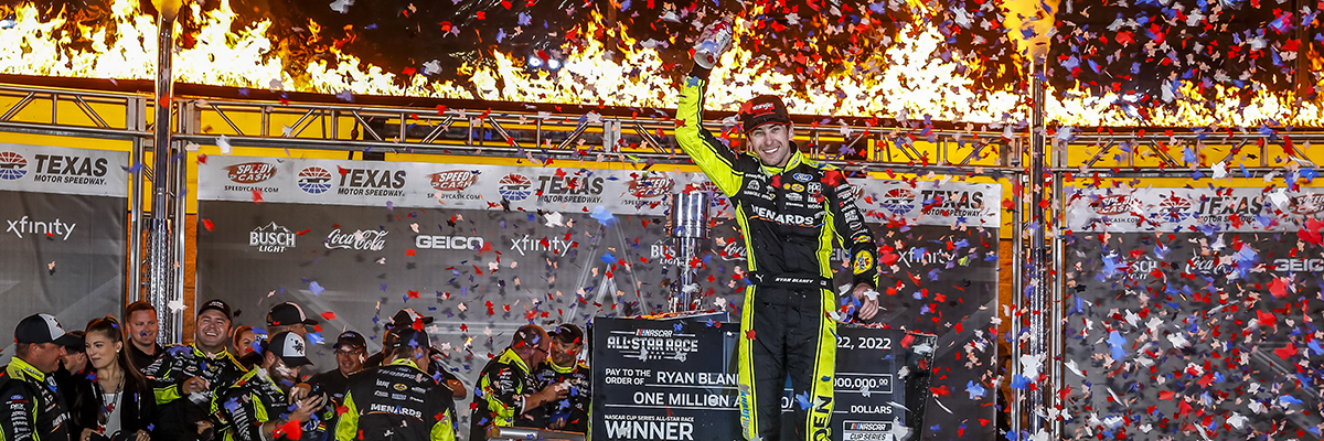 FORT WORTH – Ryan Blaney won his first career NASCAR Cup Series All-Star Race Sunday night at Texas Motor Speedway earning a $1 million payday in the annual fan favorite non-points event. And he and his team celebrated twice.