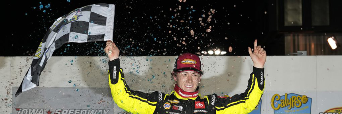NEWTON, Iowa — Brandon Jones had to wait out a three-hour weather delay and battle through a handful of challenges from the likes of Sammy Smith and Jesse Love. But ultimately, nothing was going to stop the 25-year-old from winning Saturday night’s Calypso Lemonade 150 at Iowa Speedway.