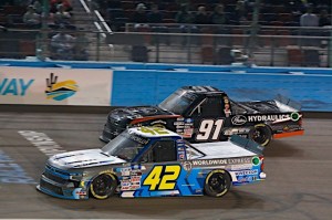 #42: Carson Hocevar, Niece Motorsports, Worldwide Express Chevrolet Silverado, #91: Colby Howard, McAnally Hilgemann Racing, Gates Hydraulics Chevrolet Silverado