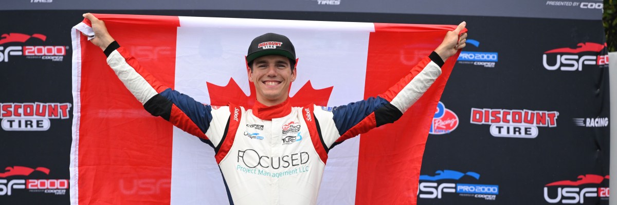 TORONTO, Ont., Canada – Michael d’Orlando continued his recent charge in USF Pro 2000 Presented by Cooper Tires by claiming a dramatic victory this afternoon for Turn 3 Motorsport in the first of two races that will comprise the Cooper Tires Grand Prix of Toronto. After the race was red-flagged following a brief shower to allow everyone to switch onto wet-weather Cooper tires, d’Orlando, from Hartsdale, N.Y., who carries duel American and Canadian citizenship, took full advantage of a late error by Myles Rowe (Pabst Racing with Force Indy) before cementing his third win in the last five races.