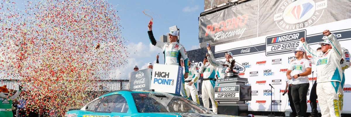 Denny Hamlin prevailed in a tight door-to-door bump-and-go pass on Kyle Larson with seven laps remaining to claim a historic all-time best seventh NASCAR Cup Series victory at Pocono (Pa.) Raceway – the win in Sunday’s HighPoint.com 400 also marking Hamlin’s 50th career trophy and second of the 2023 season.