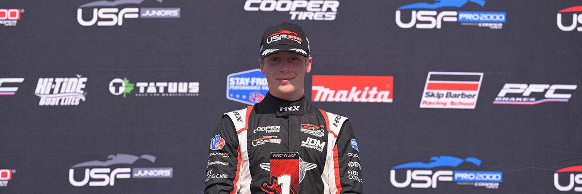 PORTLAND, Ore. – Jacob Douglas this afternoon found the perfect way to follow up on his first-ever USF2000 Presented by Cooper Tires victory – by claiming his second win in a row. The youngster from Christchurch, New Zealand, posted another exemplary performance in hot, sticky conditions at Portland International Raceway, holding off a race-long challenge from Pabst Racing teammate Simon Sikes to finished just 0.3785 of a second to the good.