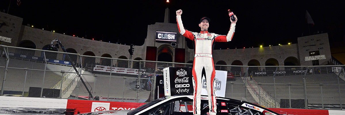 A day earlier than planned—the result of a devastating weather forecast for the Los Angeles area—Hamlin got the jump he needed on an overtime restart and won Saturday night’s third edition of the Busch Light Clash at the Coliseum.