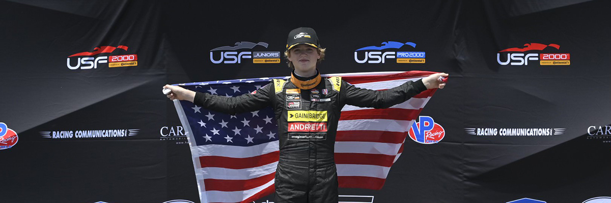 NEW ORLEANS, La. – Second-generation racer Sebastian Wheldon this afternoon romped to an emphatic USF Juniors Presented by Continental Tire debut victory to kick off this weekend’s busy Continental Tire Grand Prix of Louisiana at NOLA Motorsports Park. Wheldon, 15, from Coral Gables, Fla., claimed the lead shortly after the start from polesitting Englishman Liam McNeilly (Jay Howard Driver Development), and quickly pulled away to an unassailable lead for VRD Racing.