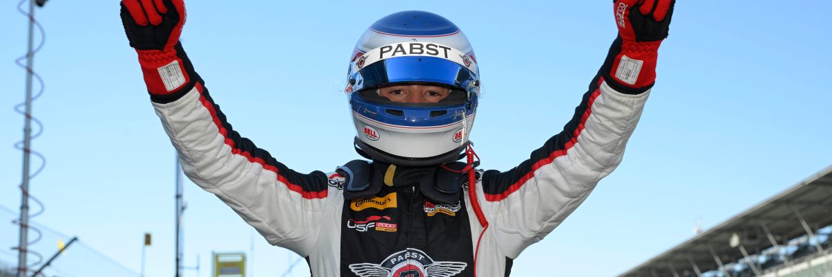 INDIANAPOLIS, Ind. – USF2000 Presented by Continental Tire championship leader Max Garcia stretched his points advantage with a somewhat fortuitous victory this morning at the Indianapolis Grand Prix road circuit. The youngster from Coconut Grove, Fla., took the lead on the final lap following a dramatic accident at Turn One involving erstwhile leaders Evan Cooley (Exclusive Autosport) and Nico Christodoulou (VRD Racing) to secure his fourth win of the season for defending champion team Pabst Racing.