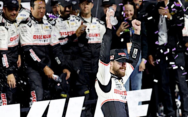 “I’m worn out out—I’ve got nothing left,” said Blaney, who ran down both Elliott and Larson from three seconds back after a restart on Lap 414.
