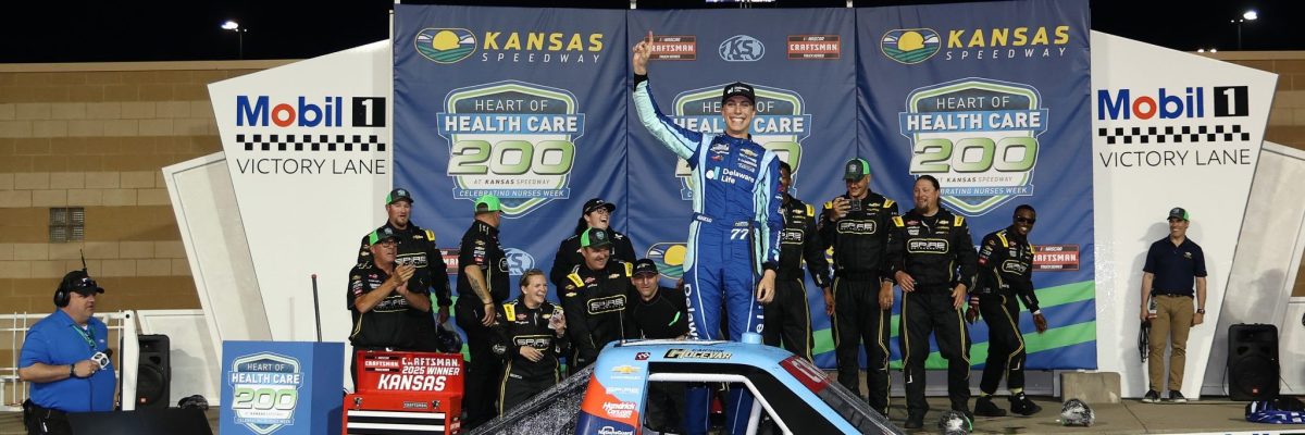 KANSAS CITY, Kan.—Carson Hocevar survived last-lap contact from the Ford of Layne Riggs, bounced off the outside wall and half a lap later took the checkered flag to win Saturday night’s Heart of Health Care 200 at Kansas Speedway.