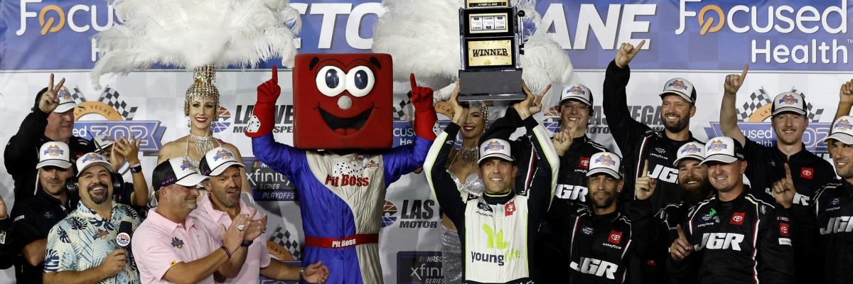 LAS VEGAS – An incredible race-long scramble among the day’s front-running trio of veteran Aric Almirola and young talents Connor Zilisch and Jesse Love ended in favor of the experienced Almirola, but he really had to earn this trophy in Saturday’s Focused Health 302 NASCAR Xfinity Series Playoff race at Las Vegas Motor Speedway.
