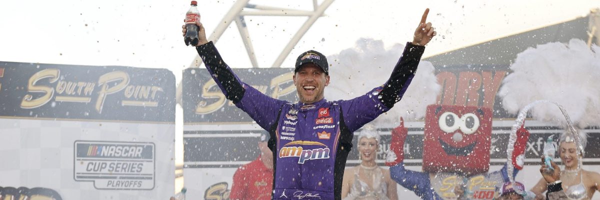 LAS VEGAS – Denny Hamlin scored an emotional victory and claimed a significant career milestone with a dramatic win in Sunday’s NASCAR Cup Series’ South Point 400 Playoff race at Las Vegas Motor Speedway.