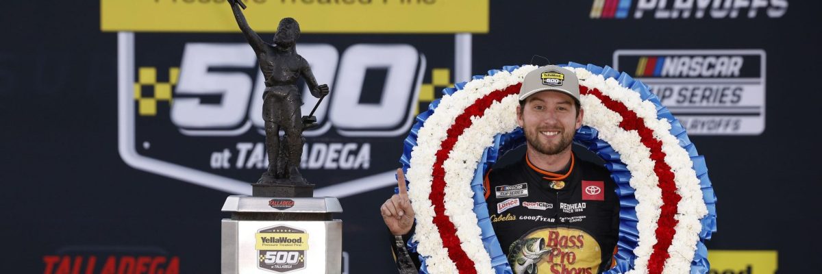 TALLADEGA, Ala. – In a typically dramatic push to the Talladega (Ala.) Superspeedway checkered flag, Joe Gibbs Racing’s Chase Briscoe made a last lap pass on the frantic-field to claim victory in Sunday’s YellaWood 500 NASCAR Cup Series Playoff race and earn his first-ever career shot at the season title.