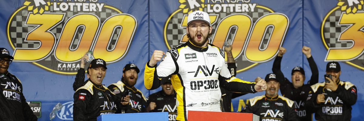 The first of the frontrunners to pit during the final 95-lap green-flag run in the Kansas Lottery 300, Taylor Gray grabbed the lead during the cycle and held off charging Sheldon Creed to score the second NASCAR O’Reilly Auto Parts Series victory of his career.