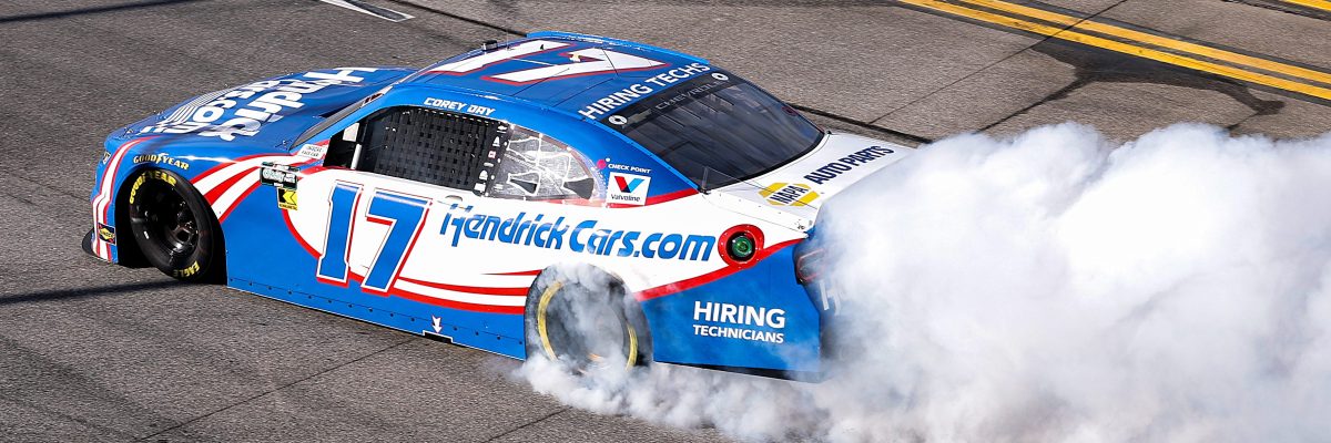 TALLADEGA, Ala. — Corey Day claimed the first NASCAR O’Reilly Auto Parts Series victory of his career Saturday afternoon, driving to the yellow and checkered flags in the Ag-Pro 300 at Talladega Superspeedway — his No. 17 Hendrick Motorsports Chevrolet leading only the last lap to earn his first trophy in his first full-time season.