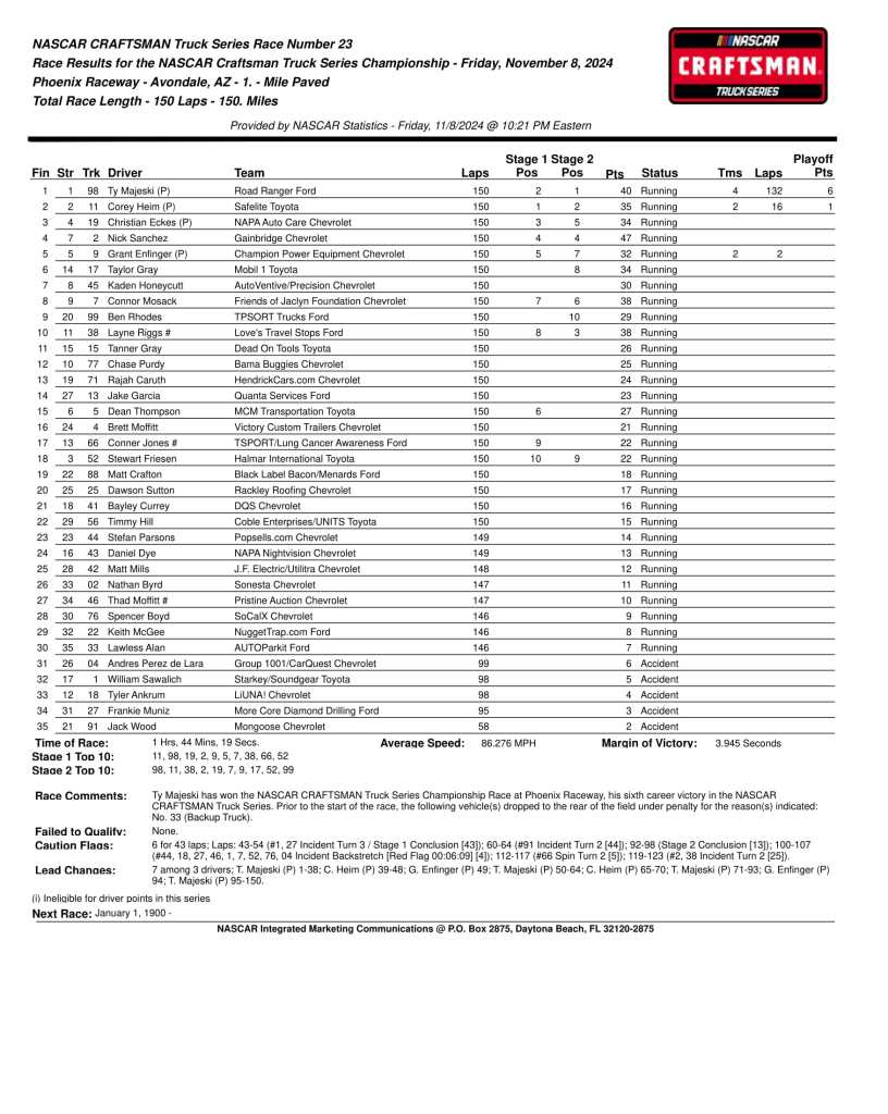 NASCAR Craftsman Truck Series Results Share this: Click to share on X (Opens in new window) X Click to share on Facebook (Opens in new window) Facebook Like Loading...