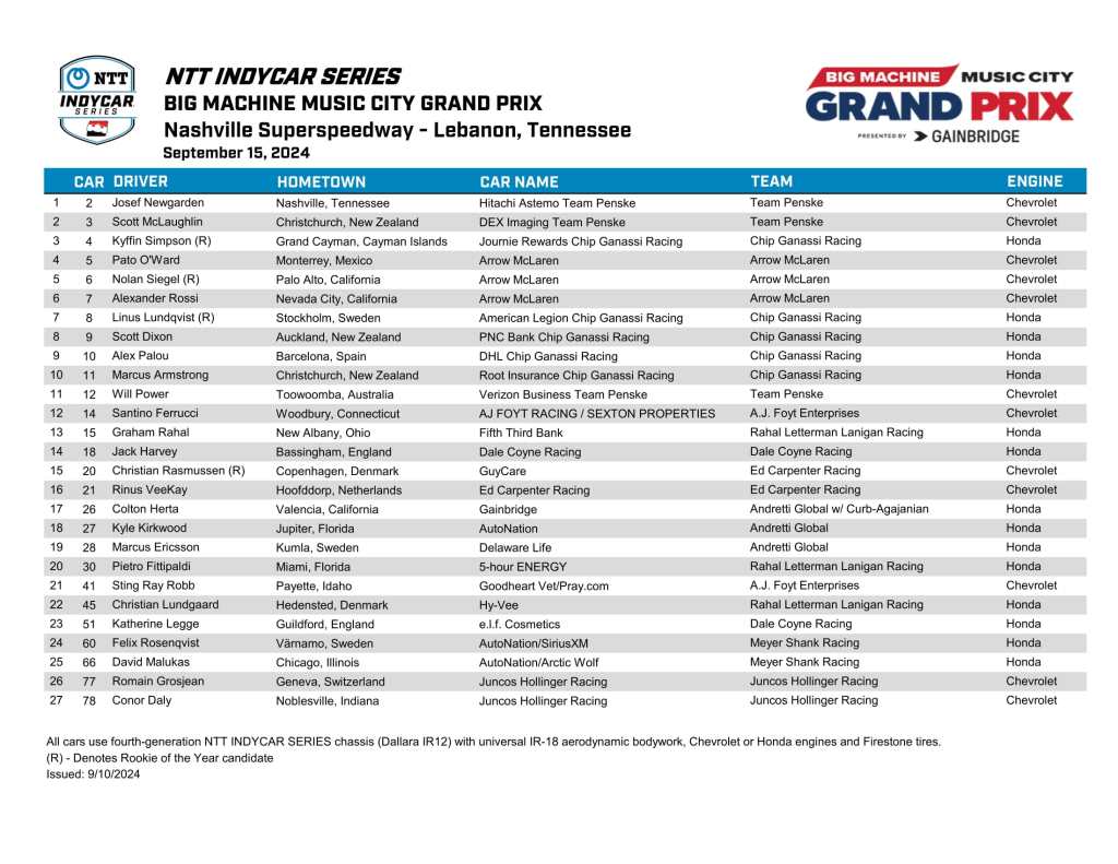 NTT IndyCar Series Entry List Share this: Click to share on X (Opens in new window) X Click to share on Facebook (Opens in new window) Facebook Like Loading...