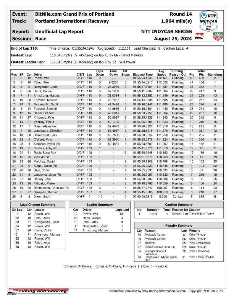 1. (1) Alex Palou, Honda, 20, Running